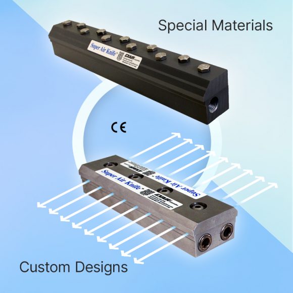 EXAIR’s Air Knives are an efficient and highly effective tool for blowoff, cooling, cleaning and drying in a myriad of manufacturing processes. To accommodate the wide variety of unique problems manufacturers face, EXAIR has the ability to customize and tailor Air Knives to different specifications. These Air Knife customizations can range from size, to shape, to material, custom mounting holes and dimensions. They are created to solve distinct manufacturing problems not already solved by the industry’s largest selection of Air Knives.
