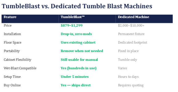 The traditional solution has been to purchase a dedicated tumble blast machine or an automated abrasive blasting cabinet. However, these systems typically cost between $2,000 and $10,000, require significant floor space, and are permanent fixtures. For shops that only need batch blasting occasionally, the ROI simply is not there.